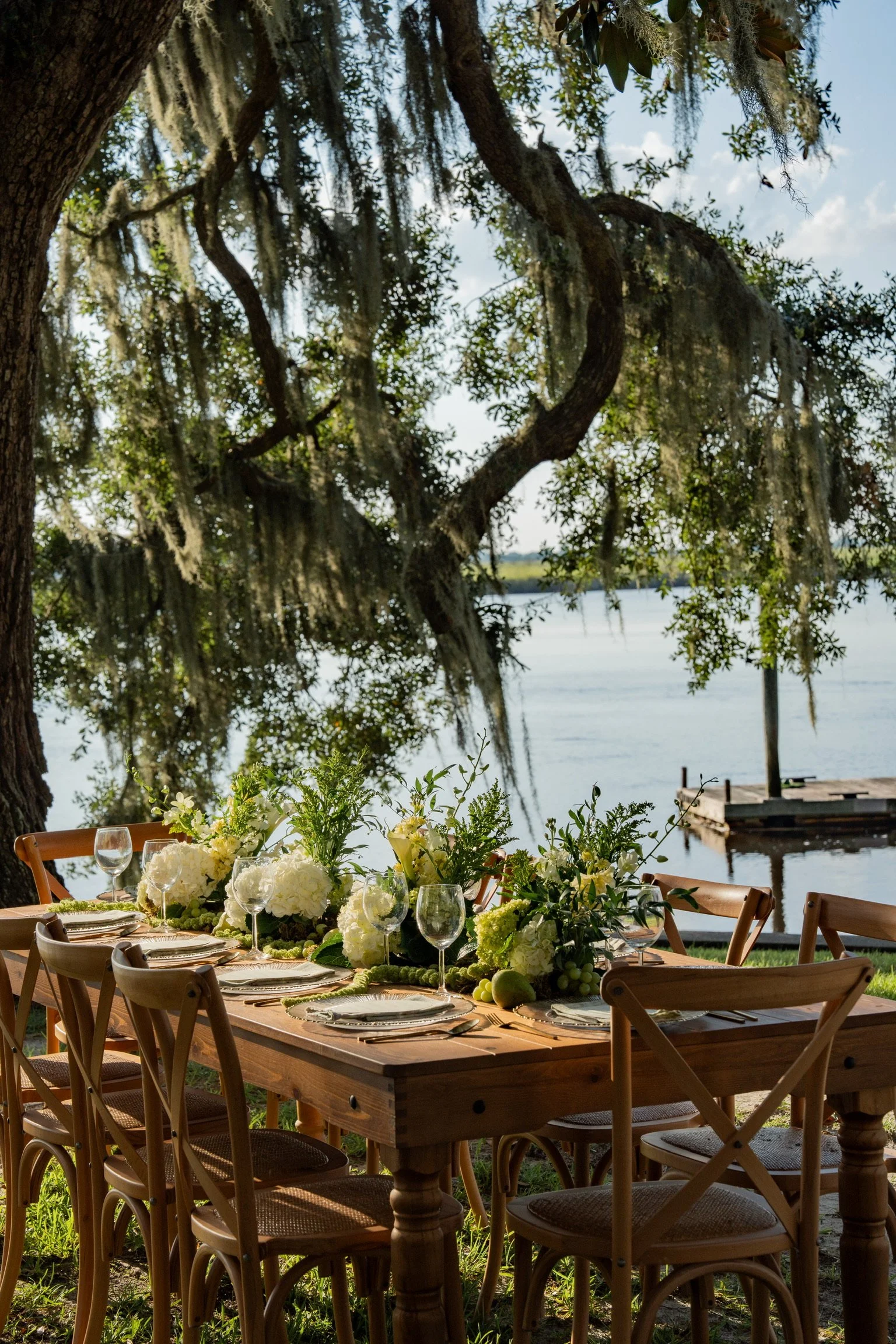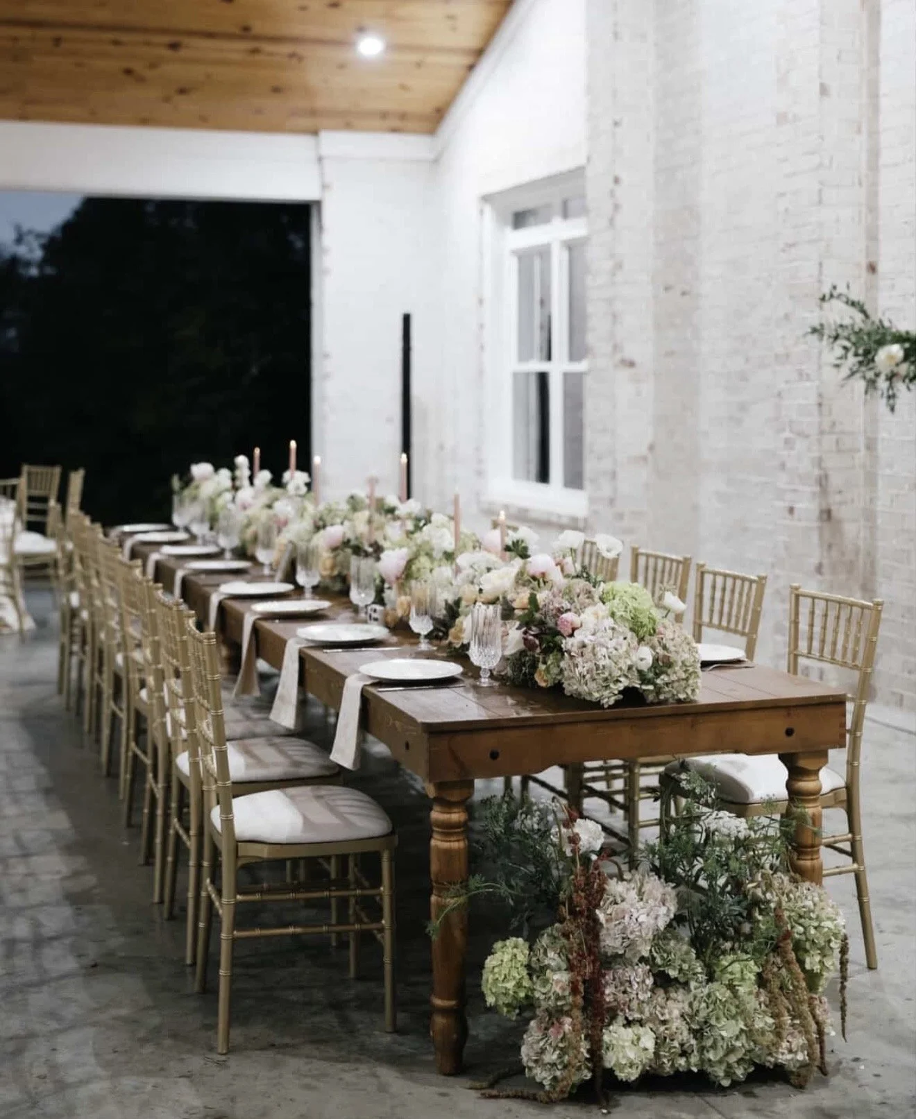 The Farmhouse Table brings a touch of nature and a rustic feel to any event. The solid wood top is made of solid pine planks with sturdy wooden legs. This gorgeous table exudes charm and character!